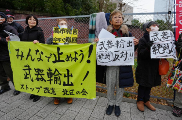 针对日本执政联盟自民党与日本维新会拟取消对武器出口的5种类型限制、为武器出口大幅“松绑”,日本民众25日下午在位于东京的自民党总部前举行抗议集会。
