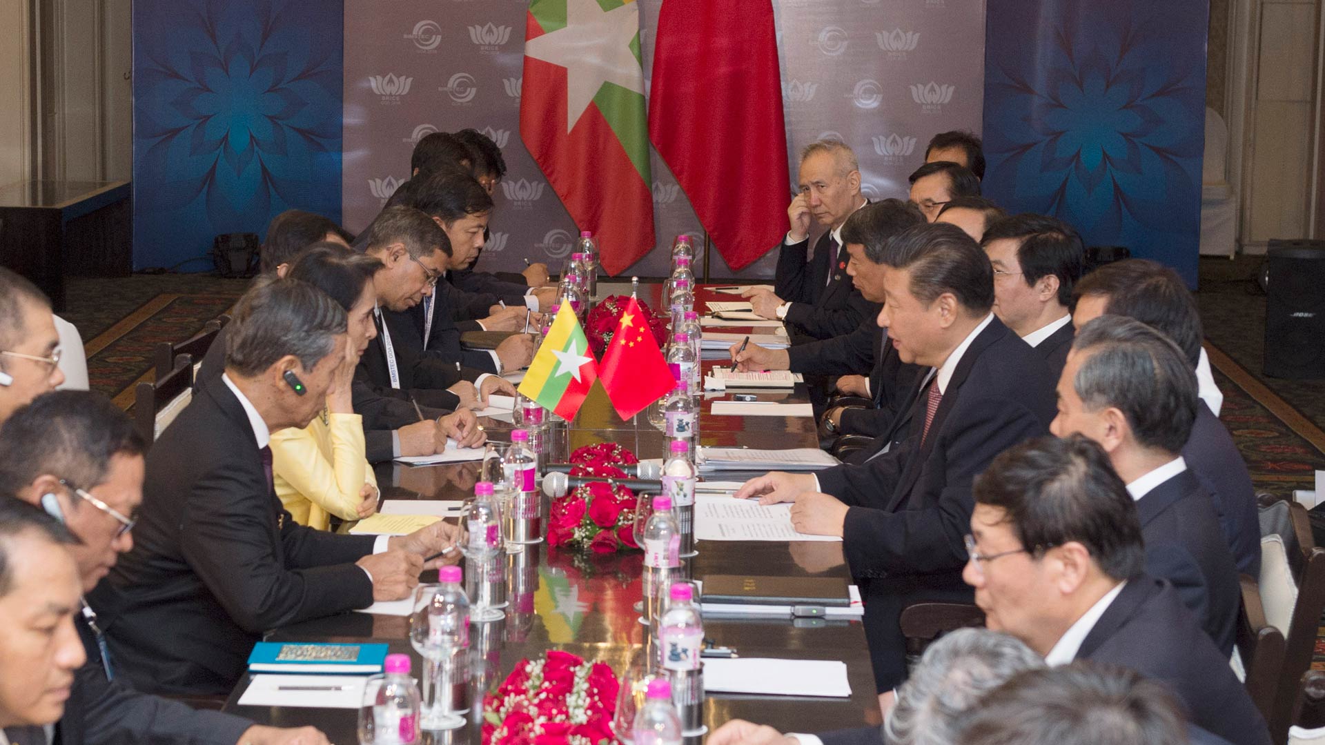 10月16日,國家主席習近平在印度果阿會見緬甸國務(wù)資政昂山素季。 新華社記者 王曄 攝