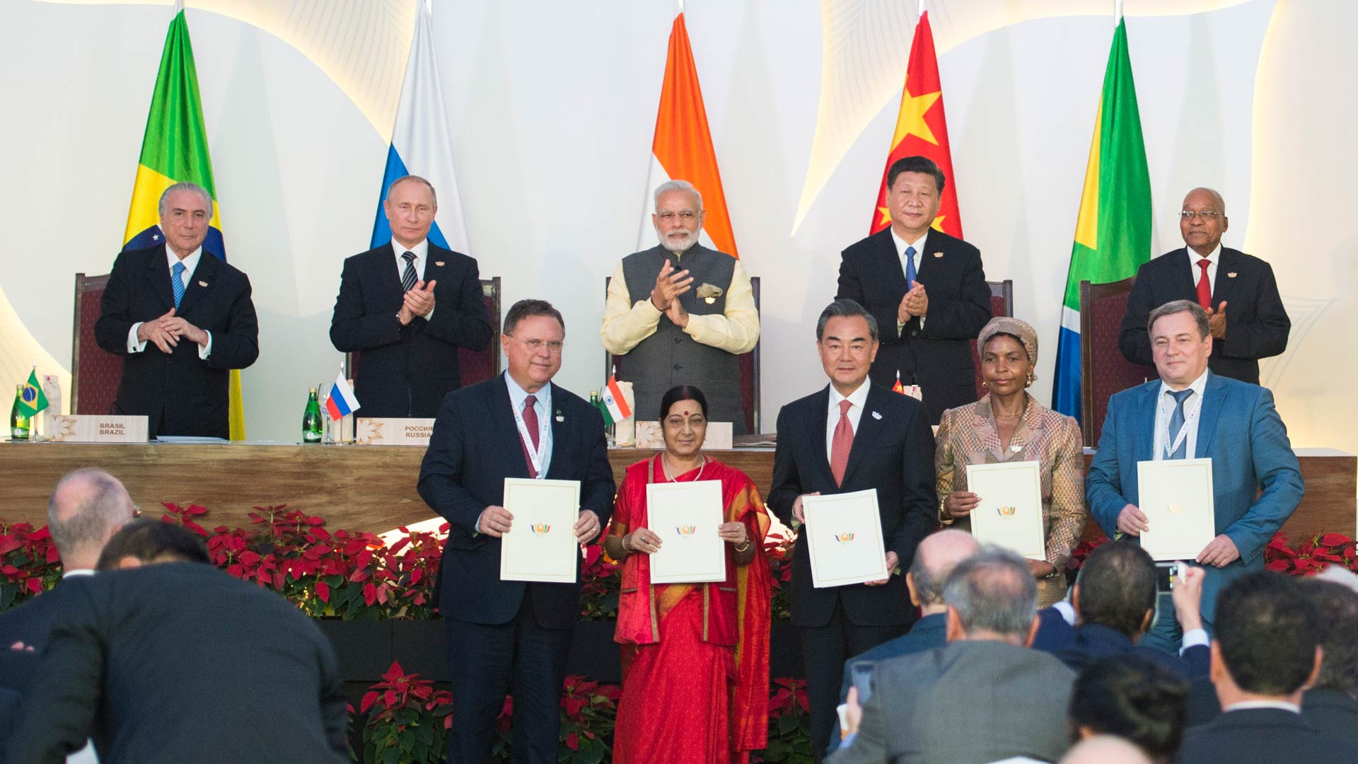 10月16日,金磚國家領(lǐng)導(dǎo)人第八次會晤在印度果阿舉行。中國國家主席習近平、印度總理莫迪、南非總統(tǒng)祖馬、巴西總統(tǒng)特梅爾、俄羅斯總統(tǒng)普京出席。這是會晤結(jié)束后,5國領(lǐng)導(dǎo)人共同見證合作文件的簽署,并出席聯(lián)合記者會。新華社記者 謝環(huán)馳 攝