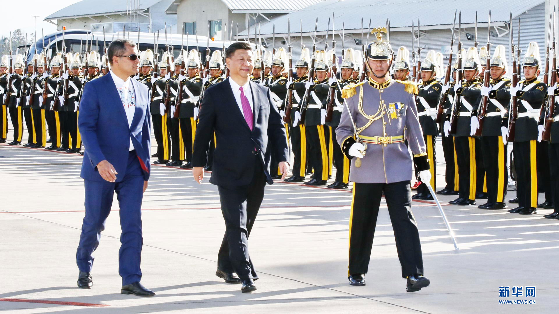 11月22日,國家主席習(xí)近平在圣地亞哥同智利總統(tǒng)巴切萊特舉行會談。這是會談前,習(xí)近平出席巴切萊特在憲法廣場舉行的隆重歡迎儀式。新華社記者 王曄 攝2016-11-23