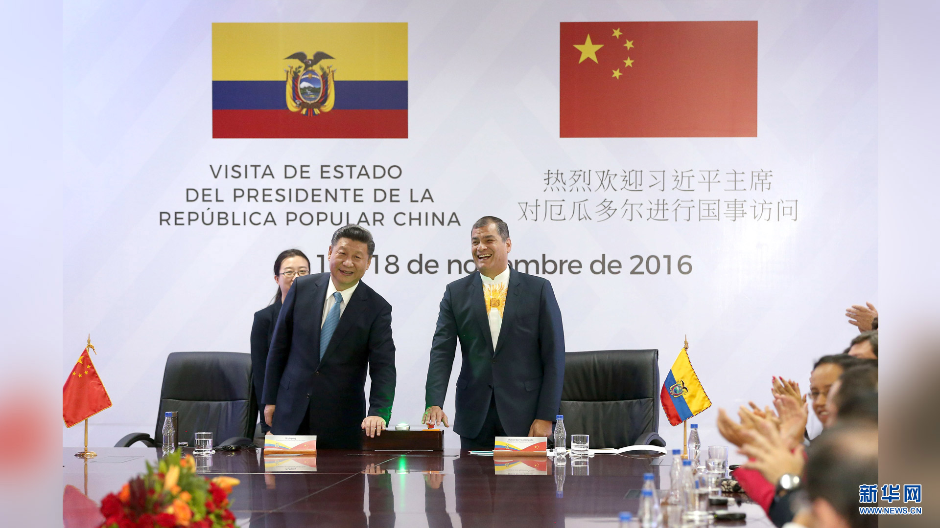 當(dāng)?shù)貢r間11月17日,國家主席習(xí)近平在基多同厄瓜多爾總統(tǒng)科雷亞舉行會談。這是會談后,兩國元首見證雙邊合作文件的簽署。 新華社記者 鞠鵬攝2016-11-18