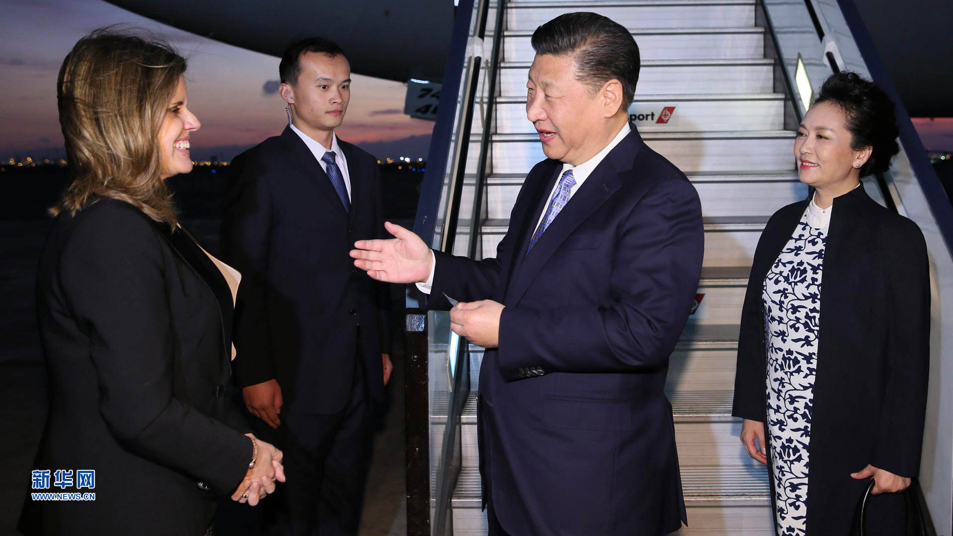 11月22日,國家主席習(xí)近平抵達圣地亞哥,對智利共和國進行國事訪問。智利外長穆尼奧斯等在機場迎接習(xí)近平和夫人彭麗媛。 新華社記者蘭紅光 攝2016-11-23