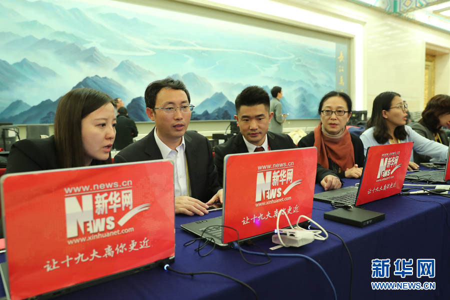 2017年10月17日下午,中國(guó)共產(chǎn)黨第十九次全國(guó)代表大會(huì)新聞發(fā)言人在人民大會(huì)堂三樓金色大廳舉行新聞發(fā)布會(huì),并回答中外記者的提問。圖為新華網(wǎng)記者在做直播準(zhǔn)備。新華網(wǎng) 翟子赫 攝