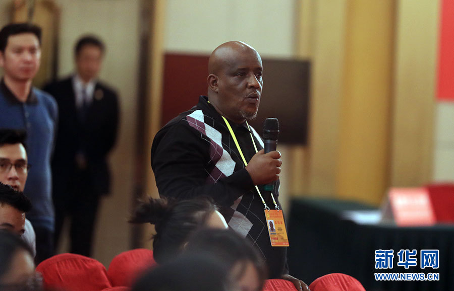 ??? 10月19日,十九大新聞中心舉辦集體采訪,邀請政法戰(zhàn)線代表談全面推進依法治國。圖為肯尼亞記者提問。新華網 郝廣鵬攝
