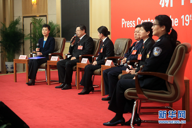 ??? 10月19日,十九大新聞中心舉辦集體采訪,邀請(qǐng)政法戰(zhàn)線代表談推進(jìn)全面依法治國。圖為采訪現(xiàn)場。新華網(wǎng) 郝廣鵬攝