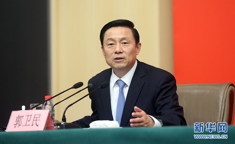 ??? 10月21日,十九大新聞中心舉辦記者招待會,邀請中共中央統(tǒng)戰(zhàn)部常務(wù)副部長張裔炯、副部長冉萬祥,中共中央對外聯(lián)絡(luò)部副部長郭業(yè)洲介紹黨的統(tǒng)一戰(zhàn)線工作和黨的對外交往情況,并回答記者提問。圖為主持人郭衛(wèi)民。新華網(wǎng) 郝廣鵬攝