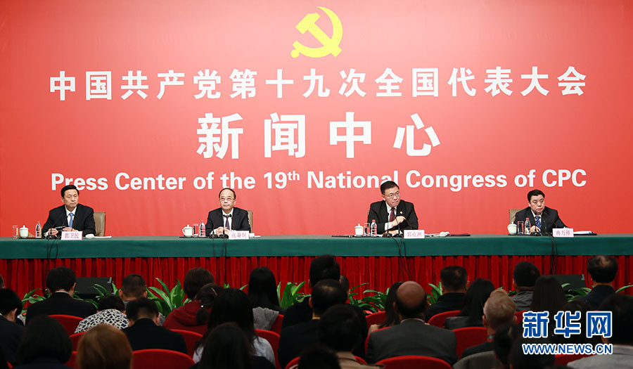 10月21日,十九大新聞中心舉辦記者招待會,邀請中共中央統(tǒng)戰(zhàn)部常務(wù)副部長張裔炯、副部長冉萬祥,中共中央對外聯(lián)絡(luò)部副部長郭業(yè)洲介紹黨的統(tǒng)一戰(zhàn)線工作和黨的對外交往情況,并回答記者提問。圖為記者招待會現(xiàn)場。新華網(wǎng) 郝廣鵬攝