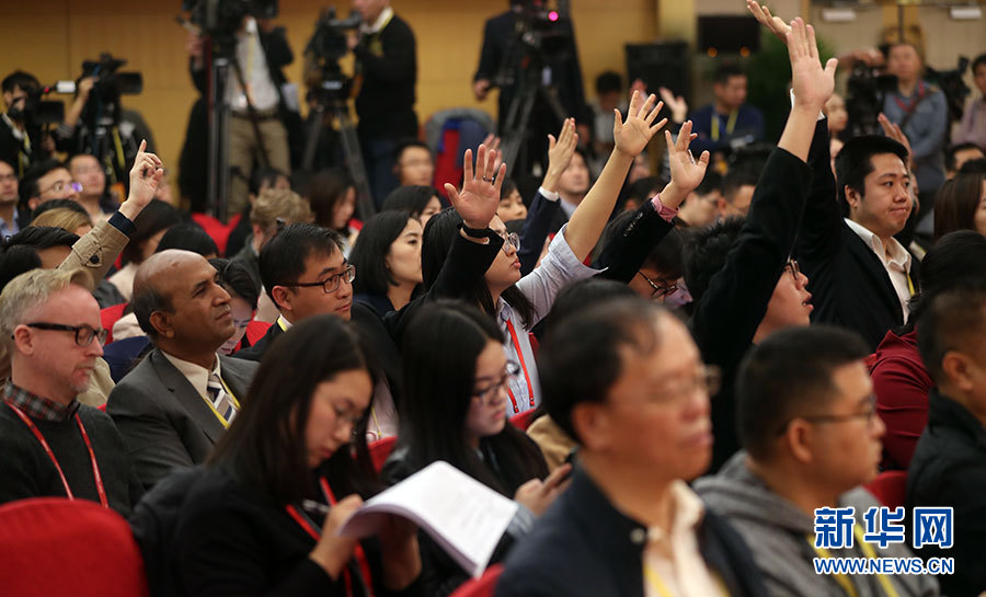 10月21日,十九大新聞中心舉辦記者招待會,邀請中共中央統(tǒng)戰(zhàn)部常務副部長張裔炯、副部長冉萬祥,中共中央對外聯(lián)絡(luò)部副部長郭業(yè)洲介紹黨的統(tǒng)一戰(zhàn)線工作和黨的對外交往情況,并回答記者提問。圖為現(xiàn)場記者。新華網(wǎng) 郝廣鵬攝