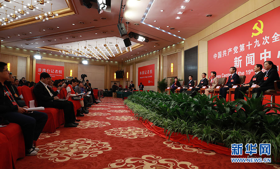 10月22日,十九大新聞中心在梅地亞中心二層新聞發(fā)布廳舉辦集體采訪活動,邀請教育領(lǐng)域代表談“教育綜合改革”。圖為集體采訪活動現(xiàn)場。新華網(wǎng) 郝廣鵬攝