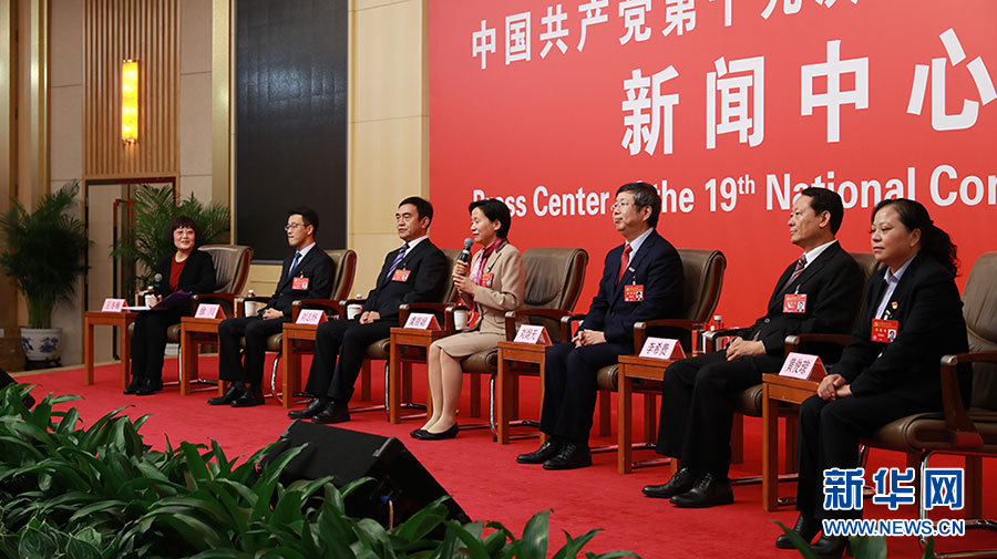 10月22日,十九大新聞中心在梅地亞中心二層新聞發(fā)布廳舉辦集體采訪活動,邀請教育領(lǐng)域代表談“教育綜合改革”。圖為集體采訪活動現(xiàn)場。新華網(wǎng) 郝廣鵬攝