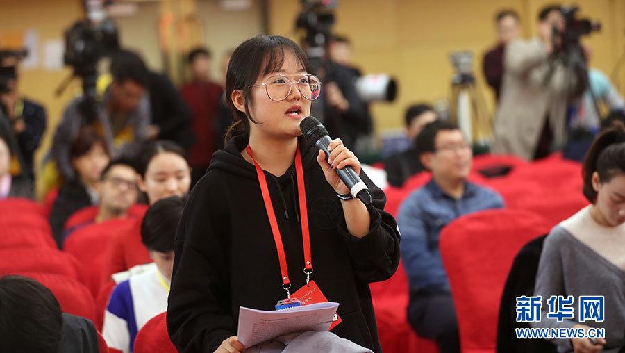 10月22日,十九大新聞中心在梅地亞中心二層新聞發(fā)布廳舉辦集體采訪活動,邀請教育領域代表談“教育綜合改革”。圖為人民日報記者提問。新華網 郝廣鵬攝