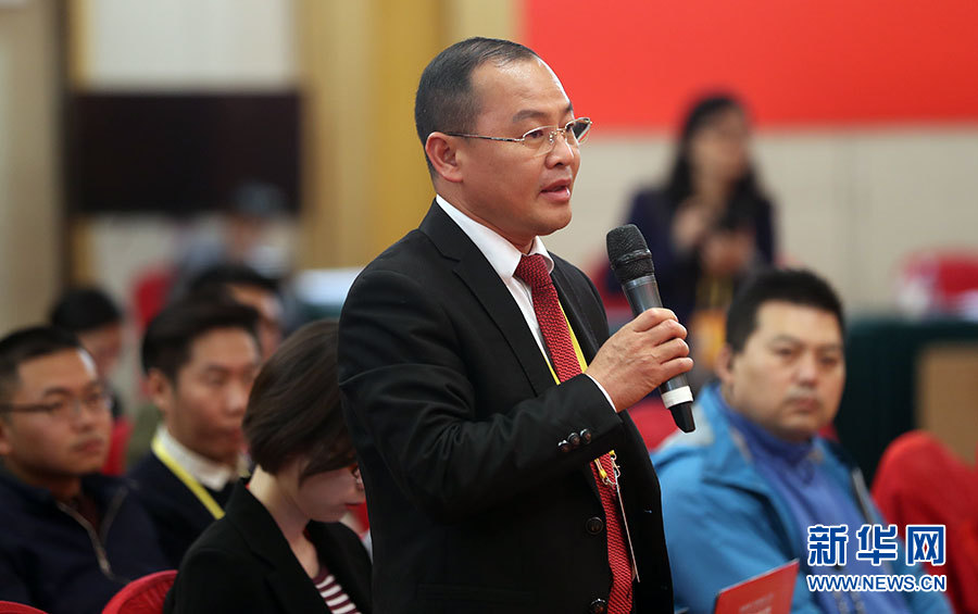 10月22日,十九大新聞中心在梅地亞中心二層新聞發(fā)布廳舉辦集體采訪活動,邀請教育領(lǐng)域代表談“教育綜合改革”。圖為美國全美電視臺記者提問。新華網(wǎng) 郝廣鵬攝
