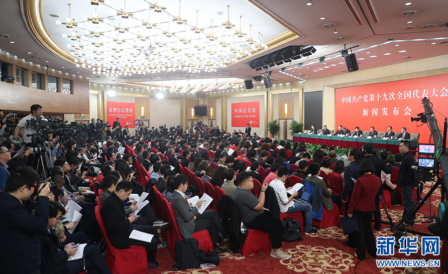 10月26日上午10:00,中國共產(chǎn)黨第十九次全國代表大會新聞發(fā)言人在梅地亞賓館二層新聞發(fā)布廳召開專題新聞發(fā)布會,請有關(guān)方面負責(zé)人解讀十九大報告,并回答記者關(guān)心的問題。圖為新聞發(fā)布會現(xiàn)場。新華網(wǎng) 王翰林 攝