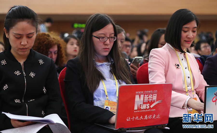 10月26日上午10:00,中國共產(chǎn)黨第十九次全國代表大會新聞發(fā)言人在梅地亞賓館二層新聞發(fā)布廳召開專題新聞發(fā)布會,請有關(guān)方面負責人解讀十九大報告,并回答記者關(guān)心的問題。圖為現(xiàn)場媒體記者。新華網(wǎng)?翟子赫 攝