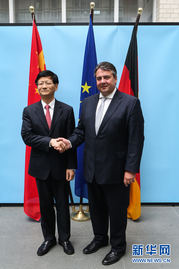 ?? ?6月29日,習(xí)近平主席特使、中共中央政治局委員、中央政法委書(shū)記孟建柱(左)在德國(guó)首都柏林會(huì)見(jiàn)德國(guó)副總理兼經(jīng)濟(jì)和能源部長(zhǎng)加布里爾。新華社記者張帆攝