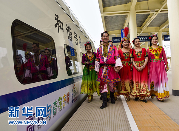 身穿民族服飾的當(dāng)?shù)鼐用裨谕卖敺闭居邮着俗案哞F杏花專列”抵達前來旅游的游客(2015年3月21日攝)。 新華社記者 趙戈 攝