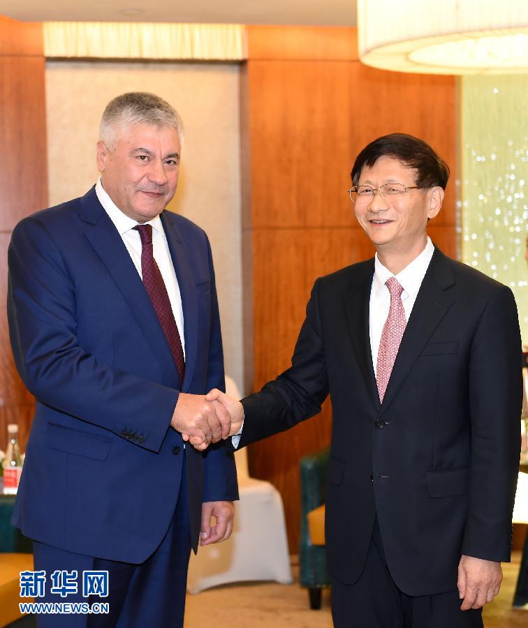 ??? 10月23日,中共中央政治局委員、中央政法委書記孟建柱在北京會見出席“安全促發(fā)展”中國東盟執(zhí)法安全合作部長級會議的俄羅斯內(nèi)務(wù)部部長科洛科利采夫。新華社記者張領(lǐng)攝