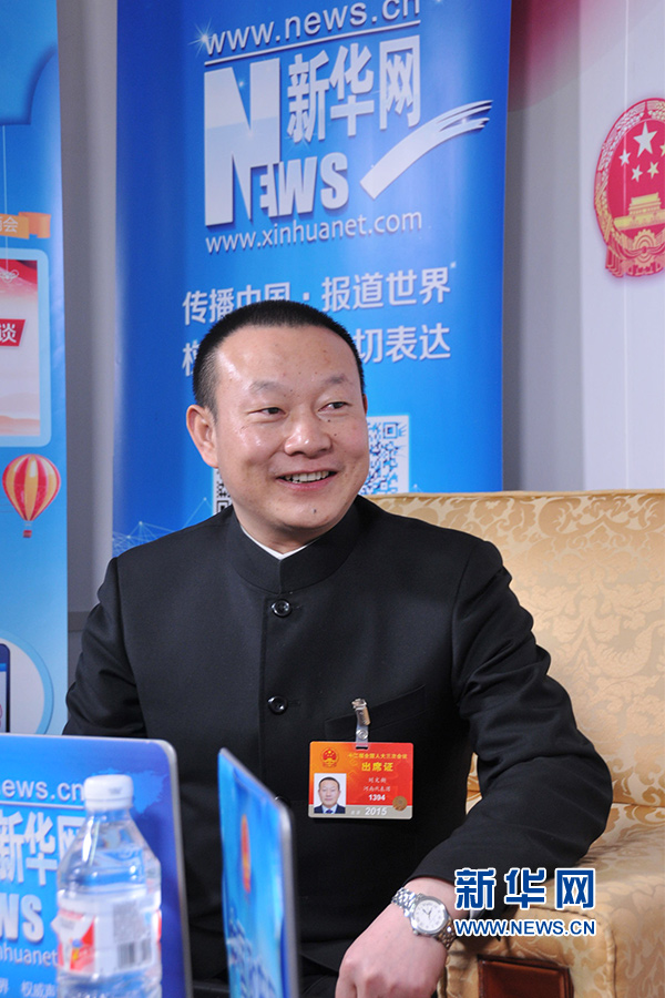 ??? 2015年3月12日,全國人大代表劉文新在人民大會堂新華網(wǎng)/中國政府網(wǎng)兩會訪談間接受記者專訪。新華網(wǎng)/中國政府網(wǎng)?李非 攝