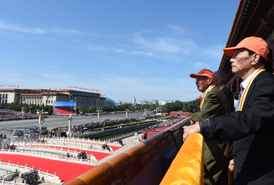 “九三閱兵”這天,李占瑞被安排在天安門城樓的第一排。雖然經過了前兩天的車馬勞頓和活動安排,李占瑞依舊神采奕奕?!疤彀查T第一排有我的座位,還寫著我的名字。我扶著欄桿,上面下面都看見了,看的很清楚。開始是直升機,有200多架,后來是戰(zhàn)斗機、轟炸機、運輸機,還有無人駕駛飛機。我都看到了。還有導彈,無數的導彈。這都是國家的國防武器,可以防止敵人侵略呀!”李占瑞爬滿褶皺的臉上閃著光。