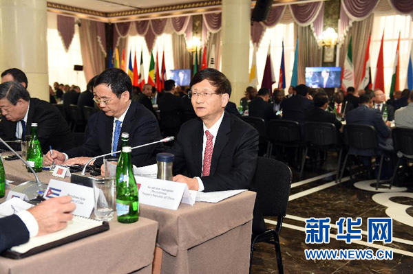 5月24日,在俄羅斯車臣共和國首府格羅茲尼,中共中央政治局委員、中央政法委書記孟建柱(前右一)在第七屆安全事務(wù)高級代表國際會議上發(fā)言。中共中央政治局委員、中央政法委書記孟建柱24日在俄羅斯車臣出席第七屆安全事務(wù)高級代表國際會議。來自70余個國家和國際組織的代表就深化國際安全合作、有效應(yīng)對恐怖主義等問題進(jìn)行探討。新華社發(fā)(郝帆攝)