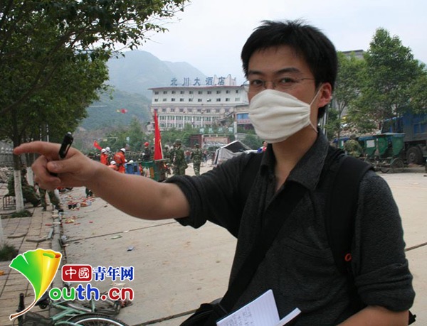 2008年5月13日,孫鐵翔在北川縣城進(jìn)行抗震救災(zāi)采訪報道。本人供圖