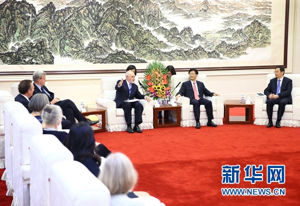 8月3日,中共中央政治局委員、中央政法委書記孟建柱在北京會見“首次中美法治對話——支持改革和經(jīng)濟增長”美方代表團。 新華社記者 丁海濤 攝