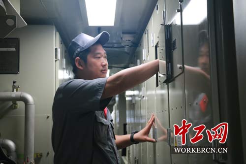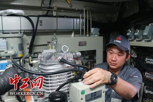 張如意在調(diào)試“和諧號”空氣壓縮機(jī)。中工網(wǎng)記者 葛文琦攝