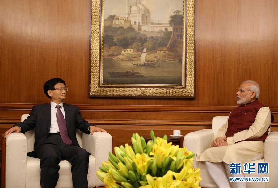????11月9日,印度總理莫迪(右)在新德里會(huì)見到訪的習(xí)近平主席特使、中共中央政治局委員、中央政法委書記孟建柱。 新華社記者李明攝