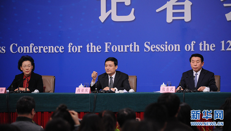 ?????十二屆全國人大四次會議新聞中心于3月12日(星期六)14時30分在梅地亞中心多功能廳舉行記者會,邀請國務(wù)院國有資產(chǎn)監(jiān)督管理委員會主任肖亞慶、副主任張喜武、副主任黃丹華和副秘書長、新聞發(fā)言人彭華崗就“國企改革”的相關(guān)問題回答中外記者的提問。圖為肖亞慶回答記者提問。新華網(wǎng)/中國政府網(wǎng) 陳杰 攝