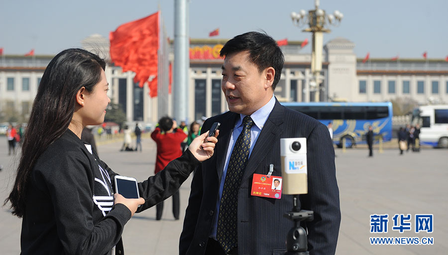 ?????3月14日,全國政協(xié)十二屆四次會(huì)議在北京人民大會(huì)堂舉行閉幕會(huì)。這是全國政協(xié)委員在人民大會(huì)堂外接受記者采訪。新華網(wǎng)/中國政府網(wǎng)??陳杰 攝