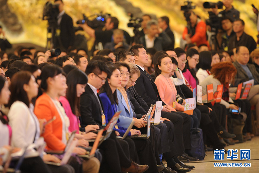 3月16日上午,國務院總理李克強在人民大會堂三樓金色大廳會見采訪十二屆全國人大四次會議的中外記者并回答記者提出的問題。圖為記者會現(xiàn)場。新華網(wǎng)/中國政府網(wǎng) 陳杰攝