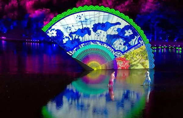 2016年9月4日晚,一場(chǎng)名為“最憶是杭州”的文藝演出在杭州西子湖畔進(jìn)行室外表演。隨著《春江花月夜》《采茶舞曲》帶著中國(guó)傳統(tǒng)文化的韻律登臺(tái)表演,360度巨型圓扇在水面上完美地映射出來,點(diǎn)燃了文藝晚會(huì)的高潮。