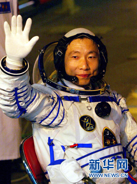 執(zhí)行中國首次載人航天飛行任務(wù)的航天員楊利偉出發(fā)登艙前揮手致意(資料照片)。新華社發(fā)