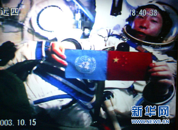 北京時間2003年10月15日18時40分,中國培養(yǎng)的第一位航天員楊利偉從太空向世界各國人民問好,并在艙內(nèi)并列展示了五星紅旗和聯(lián)合國旗(資料照片,攝于北京航天指揮控制中心大屏幕)。新華社發(fā)