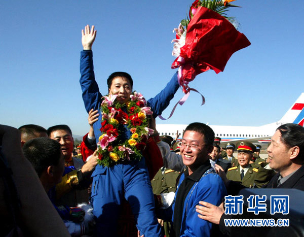 航天英雄楊利偉返回北京后被高高舉起(資料照片)。新華社發(fā)