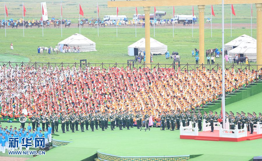 8月8日,內(nèi)蒙古自治區(qū)成立70周年慶祝大會(huì)在呼和塔拉內(nèi)蒙古少數(shù)民族群眾文化體育運(yùn)動(dòng)中心舉行。圖為升國旗儀式。新華網(wǎng)記者 陳杰 攝