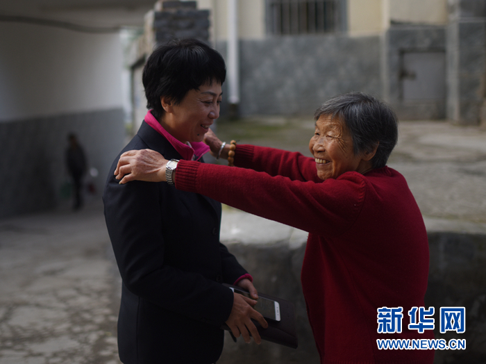田小紅(左)在青海西寧柴達(dá)木路12號(hào)小區(qū)與老黨員姜福英聊天(9月30日攝)。新華社記者 張宏祥 攝