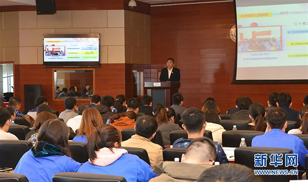 在國網(wǎng)天津?yàn)I海公司,張黎明在“十九大代表與國資系統(tǒng)青年面對面宣講會(huì)”上宣講十九大精神(11月10日攝)?!⌒氯A社發(fā)