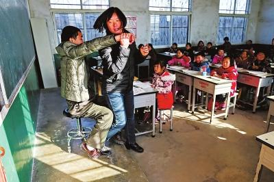 這節(jié)課,學(xué)生們聽(tīng)得很認(rèn)真。45分鐘的課程很快過(guò)去,下課后,妻子又把曹老師背了下來(lái)。“我們愛(ài)曹教師?!卑嗬镌S多小朋友告訴記者。