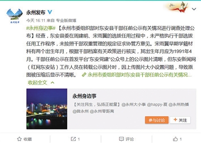 昨日,永州市委組織部通報(bào)事件調(diào)查結(jié)果稱,經(jīng)查,東安縣委在周建明、宋雨翼的選拔任用過程中,未嚴(yán)格執(zhí)行干部選拔任用工作程序,未按照干部雙重管理的規(guī)定征求協(xié)管方意見。其中,宋雨翼早期學(xué)籍材料有兩個(gè)出生年月,根據(jù)干部檔案有關(guān)政策進(jìn)行核實(shí),其出生年月應(yīng)為1991年4月。此外,關(guān)于此前公示圖片不清晰的問題,調(diào)查結(jié)果稱,干部任前公示在首發(fā)平臺“東安黨建”公眾號上的公示圖片清晰,但東安新聞網(wǎng)(紅網(wǎng)東安站)工作人員在轉(zhuǎn)載公示圖片時(shí),因上傳圖片大小設(shè)置問題,導(dǎo)致原圖被壓縮后顯示不清晰。