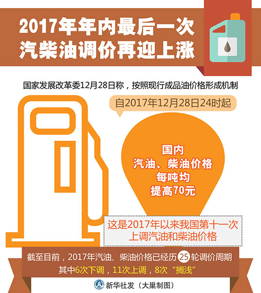 圖表:2017年年內(nèi)最后一次汽柴油調(diào)價(jià)再迎上漲 新華社發(fā) 大巢制圖