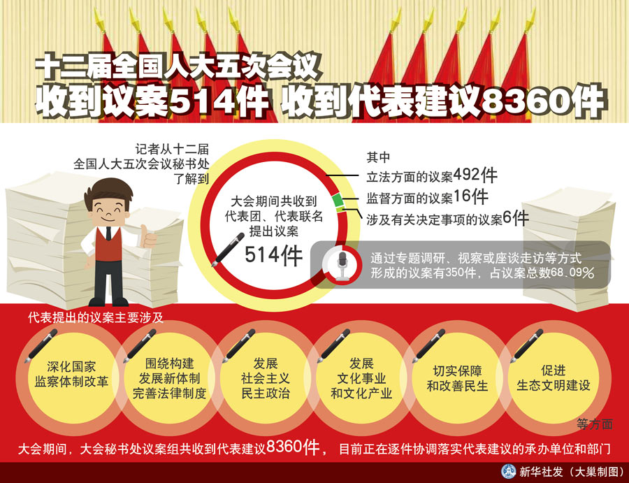 圖表:十二屆全國人大五次會(huì)議收到議案514件 收到代表建議8360件 新華社發(fā) 大巢制圖