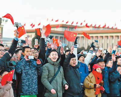 “五星紅旗迎風飄揚,勝利歌聲多么響亮……”伴隨著《歌唱祖國》的樂曲,護旗隊、禮兵依次齊步返回。數(shù)萬名群眾仍久久不愿離開,紛紛在天安門廣場拍照留念,迎接新年,向祖國送上深深的祝福。