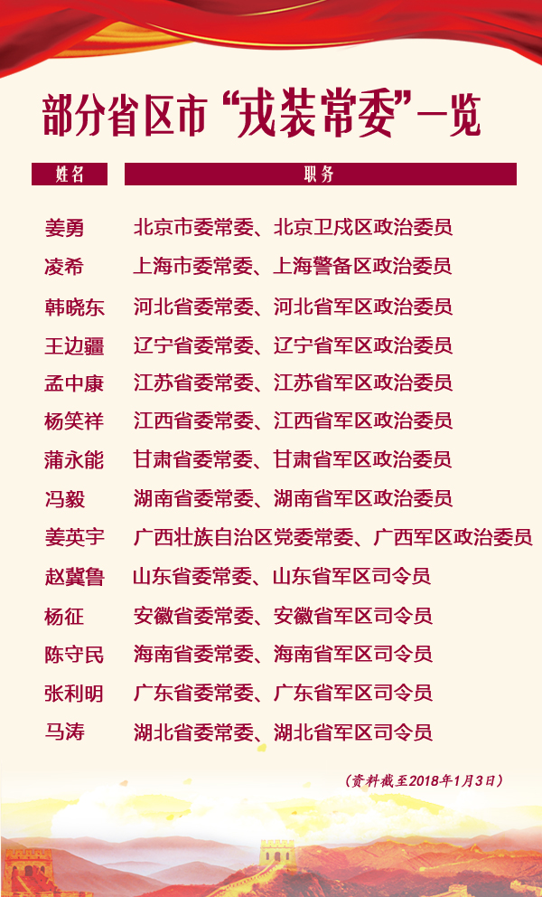 2017年12月30日,上海警備區(qū)政治委員凌希任上海市委委員、常委,河北省軍區(qū)政治委員韓曉東履新河北省委委員、常委。由此,上海、河北成為首批增補(bǔ)“戎裝常委”的省份。