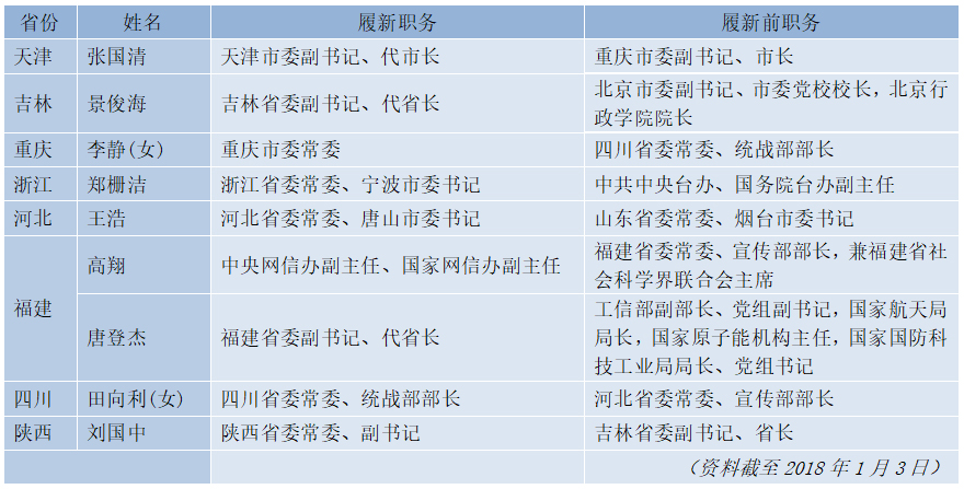 2017年12月,山東省委常委、煙臺(tái)市委書(shū)記王浩調(diào)任河北省委常委、唐山市委書(shū)記,河北省委常委、宣傳部部長(zhǎng)田向利接替李靜出任四川省委常委、統(tǒng)戰(zhàn)部部長(zhǎng),李靜轉(zhuǎn)任重慶市委委員、常委。此番履新前,王浩一直在山東任職,田向利一直在河北任職,李靜一直在四川任職。