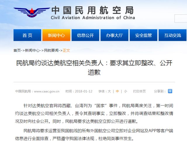 針對達美航空官網(wǎng)將西藏、臺灣列為“國家”事件,民航局高度關(guān)注,第一時間約談達美航空公司相關(guān)負責(zé)人,責(zé)令其查明事實,立即整改,并將調(diào)查結(jié)果和整改情況及時向社會公開。同時,民航局要求達美航空立即公開進行道歉。