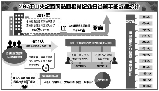《法制日報(bào)》記者逐條梳理中央紀(jì)委監(jiān)察部網(wǎng)站審查調(diào)查欄目信息統(tǒng)計(jì),該欄目在2017年總計(jì)通報(bào)黨紀(jì)處分了248名省管干部,比2016年黨紀(jì)處分省管干部240名的數(shù)量略高。