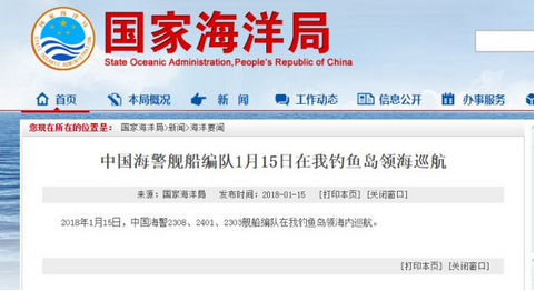 據(jù)國家海洋局網(wǎng)站消息,2017年12月30日,中國海警2306、2502、2106艦船編隊在中國釣魚島領海內巡航。2017-12-30 10:09:23