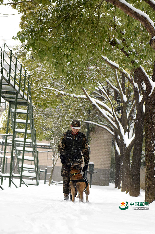 1月27日,武警安徽總隊機動支隊警犬班班長王營廣與警犬“魯克”互動交流,增進(jìn)情感。