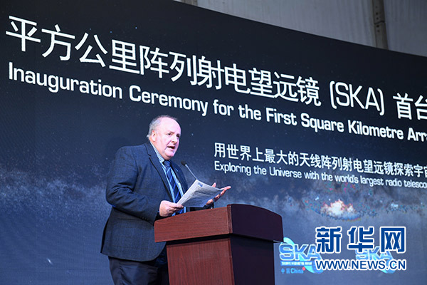 2月6日,SKA總干事菲利普·戴蒙德在SKA——平方公里陣列射電望遠(yuǎn)鏡首臺天線樣機(jī)啟動儀式上致辭。新華社記者 牟宇 攝